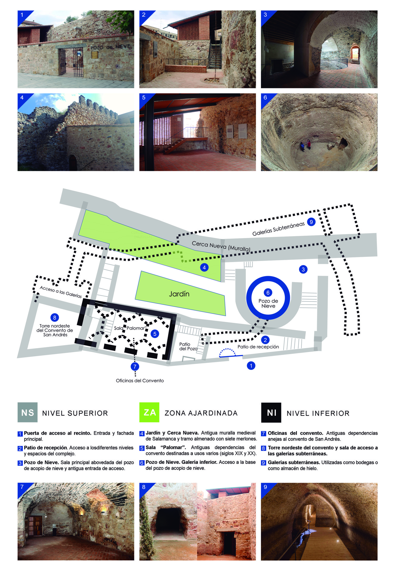Encontraremos un espectacular pozo de más de siete metros de profundidad cubierto por una bóveda de pizarra. Pero no solo eso, también podremos admirar parte de la antigua muralla medieval de Salamanca, las caballerizas y tenadas del convento, parte de la torre nordeste del complejo… Y sobre todo, las misteriosas galerías subterráneas, de origen y función inciertos, que sumergen al visitante en lo ignoto de las profundidades de la tierra.