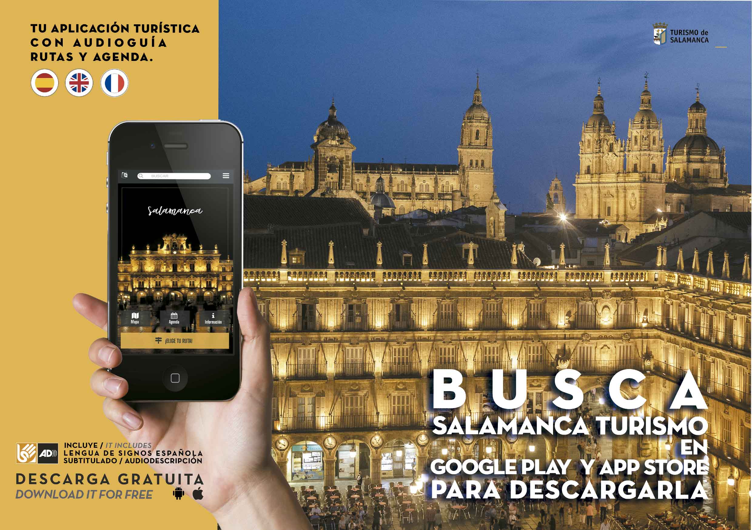 Si deseas recorrer la ciudad a tu ritmo puedes acudir a la audioguia de la ciudad (www.audioguiasalamanca.com) o la aplicación turística "Salamanca Turismo", que puedes descargar en Google Play y Aple Store, es gratuita y ofrece subtítulos y lengua de signos.